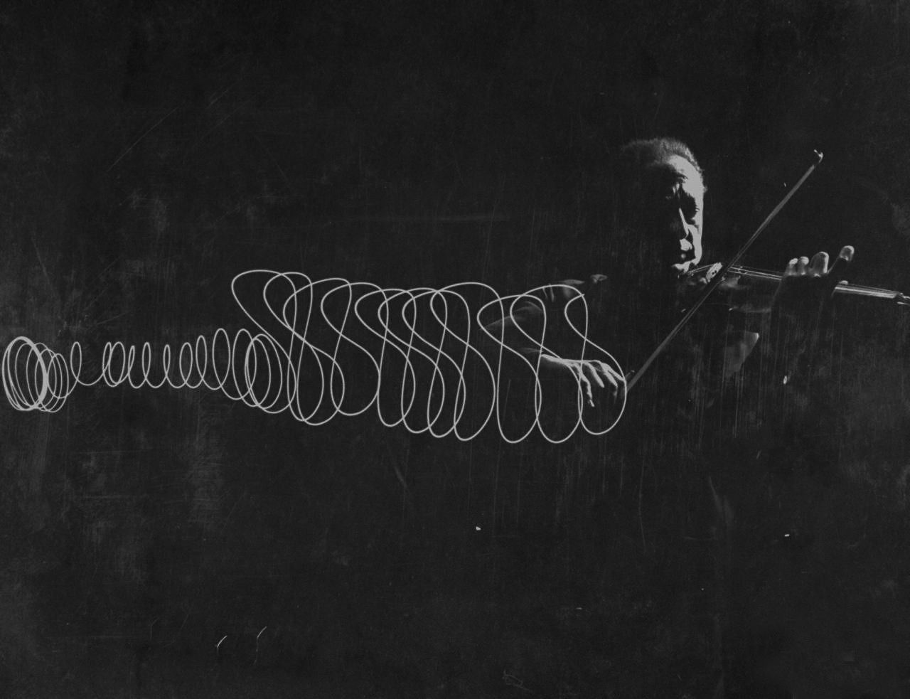Musique toujours avec Jascha Heifetz en 1952 dans le studio de Gjon Mili, immense photographe de Life qui avait eu l'idée d'accrocher à l'archet une petite lumière pour illustrer les mouvements du violoniste. Pas con. Et puis une petite flotte de Concordes (tous ceux de la British Airways en 1986), un petit tête-à-tête mal embouché et c'est reparti.